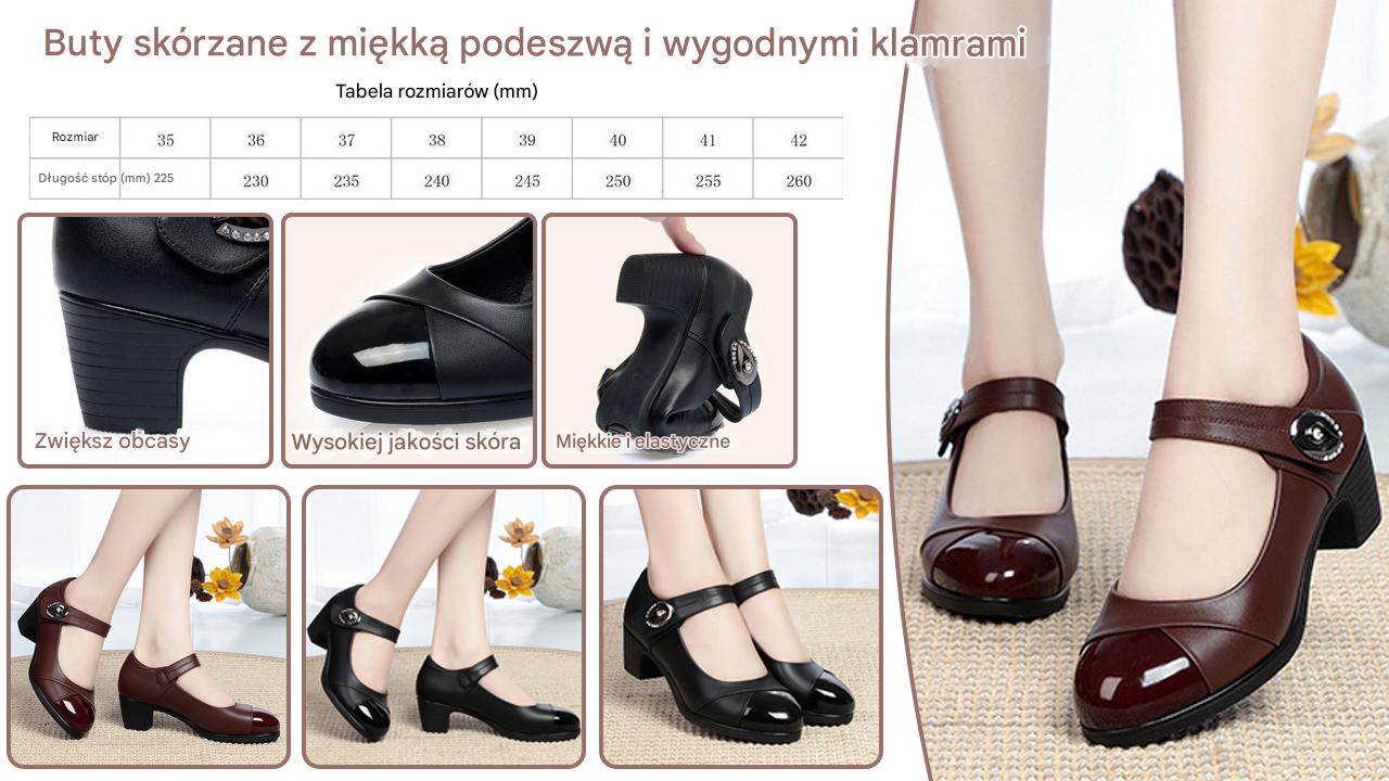 Damskie skórzane buty na grubym obcasie, z okrągłym noskiem i miękką podeszwą (rozmiary 35-40)